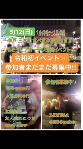 管理人様、貴重なスペース失礼します。 5/12(日)夕方から神戸:三宮のそごうの屋上で食べ飲み放題付きビアガーデン交流イベントを開催致します!(^^)! 5/12(日)神戸:三ノ宮☆食べ飲み放題付き♪夕方開催☆ビアガーデン交流イベント いよいよ平成から令和になるこの5月 令和最初のビアガーデン交流イベントを開催致します(≧∇≦) 5月12(日)夕方 ☆三宮:SOGOのビアガーデン会場にてビアガーデン交流会イベントを開催致します。 ☆16:30開催18:30終了となっております。 ☆途中参加退室可能です! ☆メニューは