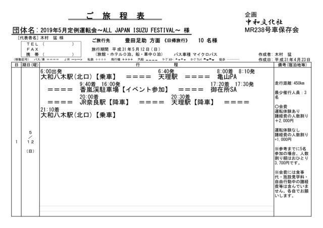 今回は毎年恒例、ALL JAPAN ISUZU FESTIVALに参加します。 <集合場所・出発時間> 大和八木駅(北) 6:00発(南側ではありませんご注意ください) 天理駅 6:40発 ※途中の経路上での乗降もご相談に応じます。ただし会費は同額です。 <最少催行人員> 3名 <会費> 運転体験あり:2,000円+諸経費の人数割り 運転体験なし;1,000円+諸経費の人数割り ※諸経費の人数割りについてはおひとりの上限6,200円とさせていただきます。それ以上になることはありません。 ※参考までに5名参加の場合だと一人あたりの人数割り額は3,700円で