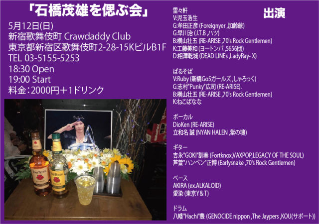 5/12 ËÜÆü¤Ï¡ÖÀж¶ÌÐͺ¤ò¼Å¤Ö²ñ¡× OPEN 18:30 START 19:00 CHARGE 2000±ß º£Ç¯¤âÀж¶ÌÐͺ¤ÎÌ¿Æü¡¢5·î12Æü¤¬¶á¤Å¤¤¤Æ»²¤ê¤Þ¤·¤¿¡£ ºòǯ¤ÏÌ¿Æü¤¬½µËöÅÚÍËÆü¤È¤¤¤¦¤³¤È¤â¤¢¤ê¡¢Ìó8ǯ¤Ö¤ê¤Ë ¡Ö¼Å¤Ö²ñ¡×¤ò³«ºÅ¤¤¤¿¤·¤Þ¤·¤¿¡£ º£Ç¯¤âÆüÍËÆü¤È¤¤¤¦¤³¤È¤Ç¡¢ºòǯ¤Ë³¤¡Ö¼Å¤Ö²ñ¡×¤ò³«ºÅ¤¤¤¿¤·¤Þ¤¹¡£ Á°²ó¤Ï;¶½¤Ç¡¢Í롹¸®¤ÎÌó7ǯ¤Ö¤ê¡¢°ìÌë¸Â¤ê¤Î¥é¥¤¥Ö¤ò¹Ô¤¤¤Þ¤·¤¿¤¬¡¢º£²ó¤Ï¼ñ¸þ¤òÊѤ¨¤Þ¤¹¡£ Àж¶ÌÐͺ¤¬¹¥¤¤À¤Ã¤¿¥Ð¥ó¥É¡¢¥¢¡¼¥Æ¥£¥¹¥È¤Î¶Ê¤ò¡¢ÈबºßÀÒ¤·¤Æ¤¤¤¿¥Ð¥ó¥É¡ÖÍ롹¸®¡×¡Ö¤Ñ¤ë¤½¤Ð¡×¤Î¥á¥ó¥Ð¡¼¤òÃæ¿´¤È¤·¤¿Í»Ö¤Ç¡¢¥»¥Ã¥·¥ç¥ó¥é¥¤¥Ö¤·¤Þ¤¹¡£