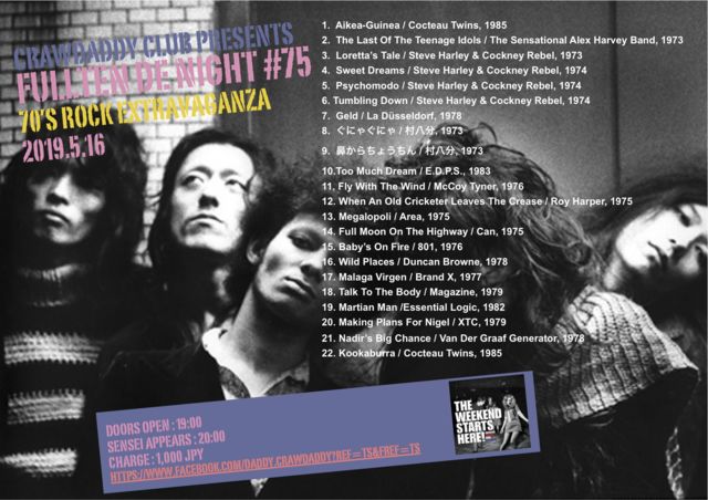 5/16 ËÜÆü¤Ï FullTen deNight 76Ìë¡¡ 70¡ÇS ROCK EXTRAVAGANZA Selcted by ÀèÀ¸¡ª OPEN 19:00 START 20:00 CHARGE 1000±ß¡¡ ¡ÖNew WaveͤꡤProgressive RockͤꡤHard Rockͤꡤˮ³Úͤê¤Ç¤¹¤¬¡¤¤À¤é¤Ã¤È¤¤¤¤¿¤¤¤È»×¤¤¤Þ¤¹¡¥ ºÇ¸å¤Î¤ª¤Þ¤±¤Ï¡¤Zeppelin¤Î1971ǯ9·î29ÆüÂçºå¸ø±é¤Î¥µ¥¦¥ó¥É¥Ü¡¼¥ÉÏ¿²»¤Ç¤¹¡¥³Î¤«¡¤9·î¤Î¤Ï¤¸¤áº¢¤ËNew York¤Ç¤ä¤Ã¤Æ¤«¤é¡¤ÆüËܤǤâ¤ä¤Ã¤Æ¤¤¤Ê¤¯¤ÆÂçºåºÇ½ªÆü¤Î¥¢¥ó¥³¡¼¥ë¤Ç¤ä¤Ã¤¿¤â¤Î¤Ç¤¹¡× ¤è¤í¤·¤¯¤ª´ê¤¤¤¤¤¿¤·¤Þ¤¹¡ª¡ª