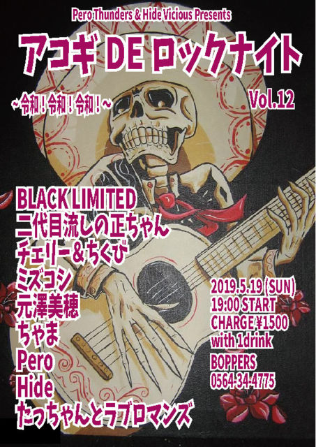 Pero Thunders & Hide Vicious Presents ¥¢¥³¥®DE¥í¥Ã¥¯¥Ê¥¤¥È¡¡Vol.12 ¡ÁÎáÏ¡ªÎáÏ¡ªÎáÏ¡ª¡Á 2019.5.19 (SUN) 19:00 START CHARGE \1500 with 1drink BLACK LIMITED ÆóÂåÌÜή¤·¤ÎÀµ¤Á¤ã¤ó ¥Á¥§¥ê¡¼¡õ¤Á¤¯¤Ó ¥ß¥º¥³¥· ¸µß·ÈþÊæ ¤Á¤ã¤Þ Pero Hide ¤¿¤Ã¤Á¤ã¤ó¤È¥é¥Ö¥í¥Þ¥ó¥º