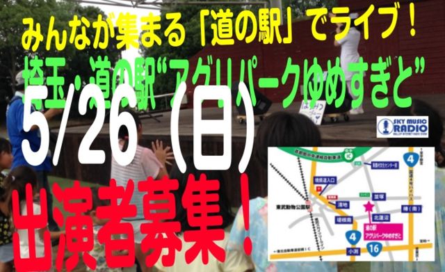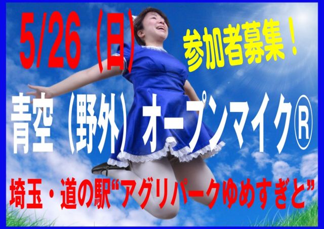 青空オープンマイク in 埼玉・道の駅“アグリパークゆめすぎと” 「SUGI ROCK FESTIVAL」参加者募集! http://ameblo.jp/special-live/entry-12132275560.html 5/26(日) 埼玉・道の駅“アグリパークゆめすぎと”「SUGI ROCK FESTIVAL」内に おいて、 通常ライヴの合間に「青空オープンマイク」の コーナーを設けますので ふるってご参加ください。 持ち時間:10分(転換込み) ジャンル指定なし。 弾き語り、オケ伴奏歌唱、アカペラ、等。 (バンド形態はNG) 参加費制(¥2000/1名) 「当日参
