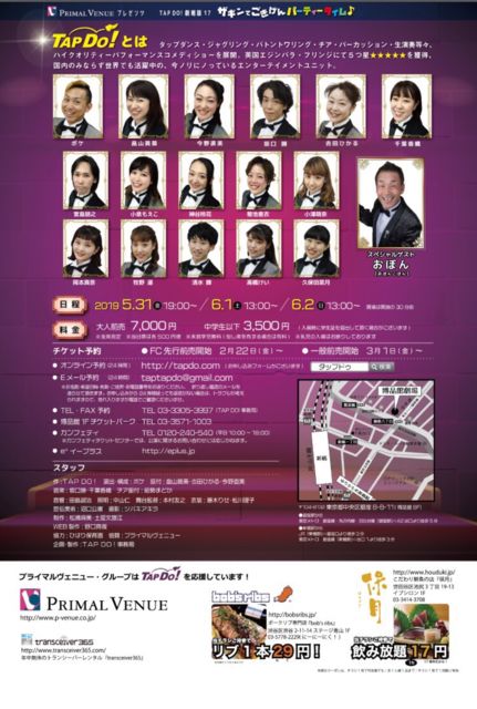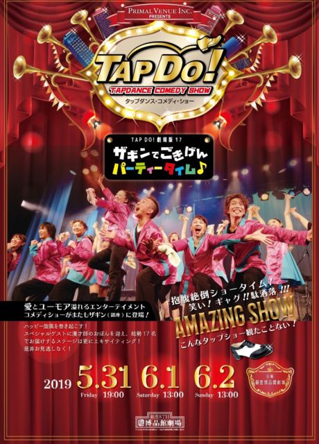 【TAP DO!劇場版17〜ザギンでごきげんパーティータイム♪〜】 抱腹絶倒ショータイム!笑い!ギャグ!!駄洒落!!! こんなタップショー観たことない! スペシャルゲストに漫才師のおぼんを迎え、総勢17名でお届けするステージは更にエキサイティング! タップダンス・ジャグリング・バトントワリング・チア・パーカッション・生演奏などを織り交ぜたハイクオリティーパフォーマンスをお楽しみ下さい。 【日時】2019年5月31日(金)19:00 6月1日(土) 13:00 6月2日(日) 13:00 (開場は開演の30分前) 【