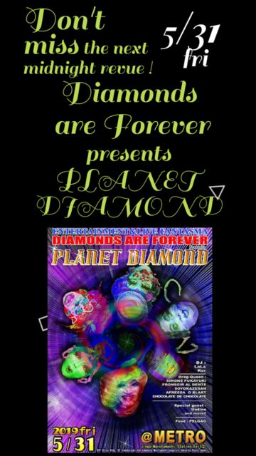 DIAMONDS ARE FOREVER Planet Diamond 2019 05 31 fri @ 京都丸太町 クラブメトロ ララ kor シモーヌ フランソワ アフリーダ そよ風さん ショコラ ウンディーネ 10:00 start ¥2000 http://www.metro.ne.jp/diamonds-are-forever-1