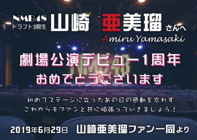 日頃より当コミュニティへのご理解ご協力を賜り、 誠にありがとうございます。 山崎亜美瑠コミュニティ管理人のきゅーぶれもんです。 2019年6月29日(土)、 山崎さんが劇場デビューから一周年を迎えます。 そこで当コミュニティから、お祝いの気持ちを込めて ささやかながらお花と記念品をお贈りしたいと思います。 内容については、こちらとLINEグループで 話し合いたいと思います。 カンパ金について、1口500円から募らせて頂きます。 みなさまのご参加、心よりお待ちしております。