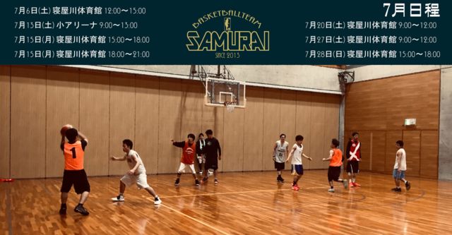 2019.6.30(日)18〜21時時寝屋川市民体育館 冷房完備してます。 快適にバスケできますよー 遅刻や早退連絡してください 参加する場合は、名前性別人数を書き込みおねがいします。 軽くアップしゲームします。 チーム分けは主催者が決めています。 Aチーム 勝ちにこだわるガチバスケ Bチーム 楽しくミックスバスケ 女子の参加者多数の場合は女子のみに可能性もあります。 初参加の方は、基本的にBチームに入ってもらいます。 募集要項 18歳以上高校生、初心者不可 男女バスケ経験者