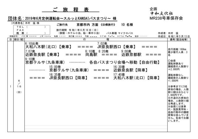 みんなでスルッとKANSAIバスまつりに行きましょう! 行きは休止になった京都線([91]八木駅〜京都駅)をリバイバル! 帰りは第二京阪・京奈和道経由です。 <集合場所・出発時間> 大和八木駅(北) 6:10発(南側ではありませんご注意ください) JR奈良駅西口 7:02発 (西口ロータリーです) ※途中の経路上での乗降もご相談に応じます。ただし会費は同額です。 ※片道だけ参加も可能です。その場合の会費は考慮いたしますが金額は直前まで確定できませんので予めご承知おきください。 <最少催行人員> 3名 <会費> 運転体験あ