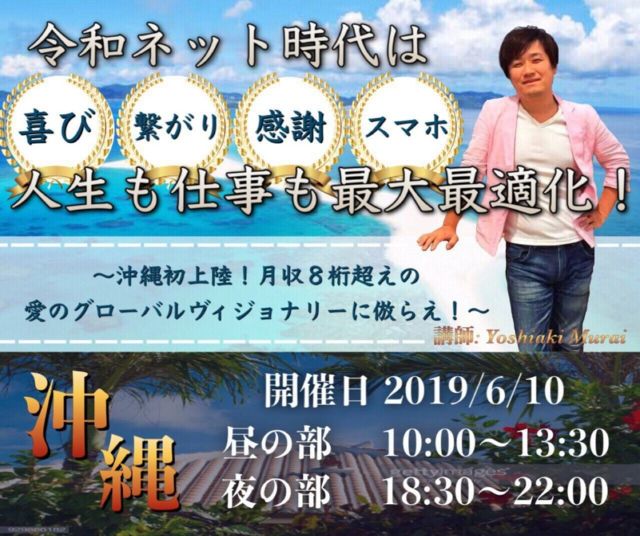 こんにちは! 6/10に沖縄で開催されるビジネスイベント情報をシェアしたく、投稿させて頂きました(*^^*) 参加者全員の度肝を抜く、沖縄初上陸のビジネスセミナー開催決定!! https://peraichi.com/landing_pages/view/u17hi ◆会社に頼らずとも生きていける術を身に付けたい ◆自分の夢を叶える時間・かけがえのない人と過ごす時間…そんな自由な時間を得たい そんな方は必見です。 このセミナーでは、時間や場所に縛られず、長期的な継続収入を実現する方法を、惜しみなくお教え致します。 講師となる【村井よしあき氏】は、 普段お会いするこ