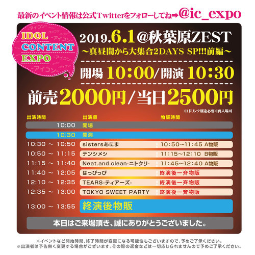 ¡ÖIDOL CONTENT EXPO¡×¡Á¿¿Ãë´Ö¤«¤éÂ罸¹ç2DAYS SP!!!Á°ÊÔ¡Á ÆüÄø¡§06/01(ÅÚ) ³«¾ì10:00 / ³«±é10:30 ²ñ¾ì¡§½©ÍÕ¸¶ZEST ÎÁ¶â¡§Á°Çä2,000±ß / ÅöÆü2,500±ß¡ÊDÊ̡ˢ¨ºÆÆþ¾ì²Ä(Í×1D) ½Ð±é¡§TOKYO SWEET PARTY / TEARS-¥Æ¥£¥¢¡¼¥º- / ¤Ï¤Ã¤Ô¤Ã¤Ô / Neat.and.clean-¥Ë¥È¥¯¥ê- / sisters¤¢¤Ë¤Þ / ¥Æ¥ó¥·¥á¥· ½Ð±é:11:40¡Á12:05 ʪÈÎ:½ª±é¸å (13:00¡Á13:55)