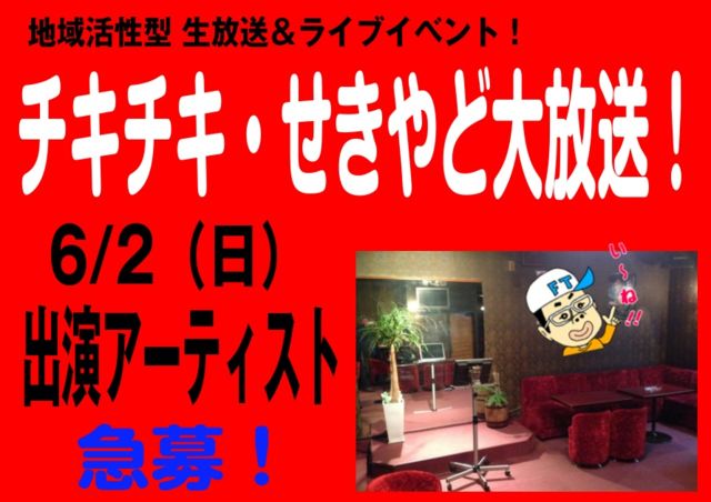 ノルマ・参加費なし!6/2(日)千葉県野田市内で開催。 地域活性ミニコンサート出演アーティスト募集。 千葉県野田市関宿のナイトラウンジのホールで 「地域活性、地域情報発信」を主な目的とした 「インターネット生放送番組内」で 「ミニライブコンサート」を開催するにあたり 「出演アーティストさん」を募集します。 <タイトル> 地域活性型生放送&ライブイベント! チキチキ・せきやど大放送!(仮) <ここがいい!> ・集客ノルマなし! ・集客数により「チャージバック」があります! ・交通が不便!(汗)最寄駅よりバ