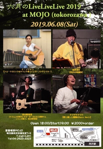 私の企画ライブのご案内をさせて頂きます。 どうぞよろしくお願いします。 .............................. 2019年6月月8日(土) 5th`六月の Live Live Live´@MOJO 演奏順【一言プロフィール】 イーノマヤコ 【フォークでロックなサウンド漂う、シンガーソングライター】 菊地規孔 【所沢の無頼派】 夜の野球場 【ドラムスの青空とギターボーカルの土砂降りとファンが集う、夜の野球場 】 ヤマザキヤマト 【愛と癒しと躍動のSpacy Music】 open 18:00 / start 19:00 ¥2000+oder
