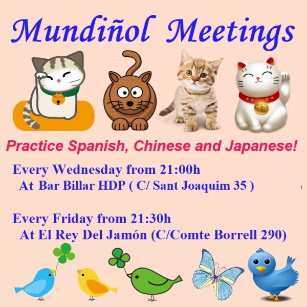 日本語スペイン語交流 MUNDIÑOL BARCELONA http://magradacatalunya.com/movil-chat-info/index.html バルセロナで日本語や日本文化と言えば、MUNDIÑOL のことが多いほど長年親しまれている日本語スペイン語交流です。 スペインやその他の国の日本が大好きな人たちや、日本語を勉強している人たちと、バルセロナに住んでいたり、旅行で来ている日本人が集まっています。スペインと日本の文化交流として多くの人たちに親しまれています。 そして、交流会では、スペイン語や日本語の練習、それぞれの国の文化や風習や流行などの紹介