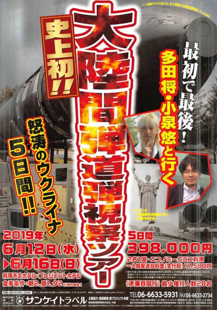 【ウクライナ大陸間弾道弾視察旅行5日間】 <ターキッシュエアライン利用> http://tour.esankei.com/detail.php?id=2054827&hf=1 ・多田将氏・小泉悠氏と行く! 1 成田空港発(21:25頃)、空路イスタンブール乗継キエフへ 2 イスタンブール着(3:35頃) イスタンブール発(7:00頃) キエフ着(8:50頃) キエフ到着後、専用車にてウクライナ国立航空博物館見学(アントノフ、イリューシン、ツボレフ、ミグ、カモフ他軍民問わず約70もの飛行機やヘリコプターの機体及び歴代エンジンのカットモデルが展示されています。若干の追加料金にて機
