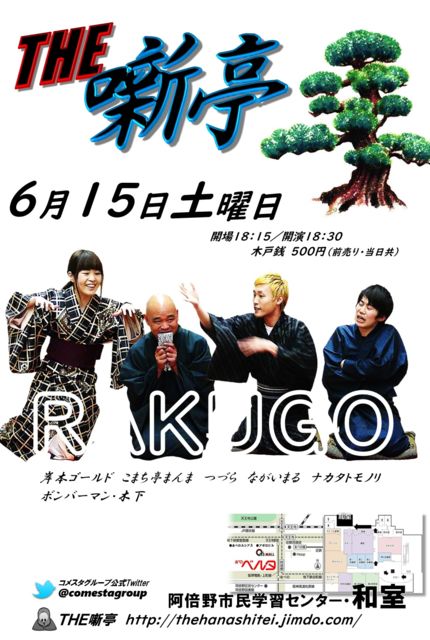 6月 15日土曜日 【 THE噺亭 】 https://thehanashitei.jimdo.com/ 開場18:15/開演18:30 あべのベルタ3階★阿倍野市民学習センター・和室 明日、来なアカンでぇ! 出演 岸本ゴールド こまち亭まんま(リスナップ・土井) つづら ながいまる ナカタトモノリ ボンバーマン・木下 是非、ご来場ください!!