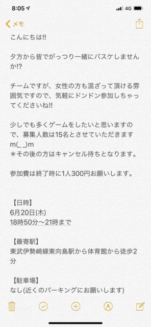 コメントか直接メッセージ頂いた方にご連絡します💁♂️ 経験者が多く、初心者は厳しいかもしれないですm(._.)m 【日時】 ・ 6/20(木) ・18:00体育館オープン。集まり次第開始。 〜21:00完全退出 【場所】 最寄駅:都営大江戸牛込神楽坂またはメトロ神楽坂 【持ち物】 ・ボール ・濃淡シャツまたはリバ ・飲み物 【参加費】 ¥300
