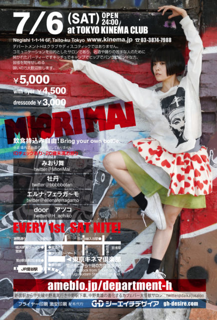 アバンギャルドなクラブパーティーです。 7月6日土曜日デパートメントH 2099 open 24:00 @鶯谷東京キネマ倶楽部http://www.kinema.jp 03−3874−7988 ¥5000/ ¥4500フライヤー持参/ ¥3000ドレスコード 飲食持込自由。会場内でアルコール類の販売はしておりません。 男女更衣室有り。 写真付IDチェック有り。 https://mixi.jp/view_event.pl?comm_id=36042&id=90050357 https://ameblo.jp/department-h/entry-12486102188.html 予告編:https://togetter.com/li/1359465 前回のあらまし:https://toget