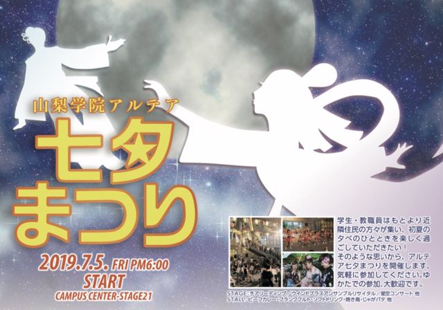 「第17回アルテア七夕まつり2019」 日時:07/05(金) 18:00〜 会場:山梨学院大学 キャンパスセンター STAGE21 甲府市酒折2−4−5 出演:18:00〜18:25