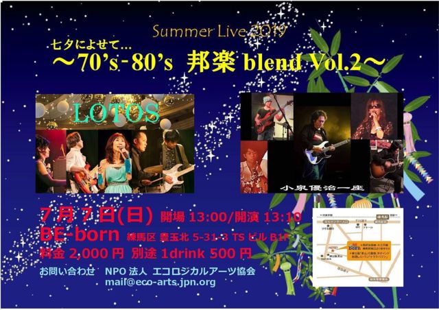 ÎýÇÏmusic & live bar BEborn ËÜÆü¡¢7·î7Æü(ÆüÍËÆü)¤Ï¡¢ ¡ÚSummer Live 2019 ¼·Í¼¤Ë¤è¤»¤Æ ¡Û ¡Á70¡Çs-80¡Çs Ë®³Úblend¡Á open 13:00 start. 13:10 charge 2,000±ß (ÊÌÅÓ1drink 500±ß) ½Ð±é ¡ú13:10-14:10 ¾®ÀôÍ¥¼£°ìºÂ ¡ú14:20-15:20 LOTOS ¡Ú¤ªµ¤³Ú¥é¥¤¥Ö¡Û Ìë¤ÎÉô open 18:30 start 19:00 charge 1600±ß (1¥É¥ê¥ó¥¯ÉÕ) ¡ú19:00-19:30 ÆâÊÛ·Ä ¡ú19:40-20:10 bitmotion ¡ú20:20-20:50 ¥°¥é¥ó¥Æ¥£ ¡ú21:00-21:30 dk(dk music) ÌÀÆü¡¢7·î8¡¢9Æü(·îÍË¡¢²ÐÍËÆü)¤Ï¡¢ ¡ÚŹµÙÆü¡Û ¢¨¿©¤Ùʪ»ý¤Á¹þ¤ß¼«Í³¤Ç¤¹¡£