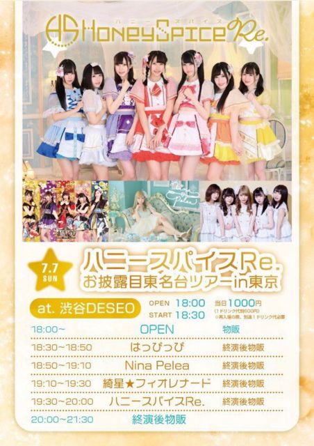 ¡Ö¥Ï¥Ë¡¼¥¹¥Ñ¥¤¥¹Re. ¤ªÈäϪÌÜÅìÌ¾Âæ¥Ä¥¢¡¼inÅìµþ¡× ÆüÄø¡§07/07(Æü) ³«¾ì18:00 / ³«±é18:30 ²ñ¾ì¡§½ÂëDESEO ÎÁ¶â¡§ÅöÆü¤Î¤ß1,000±ß (1DÊÌ) ½Ð±é¡§¥Ï¥Ë¡¼¥¹¥Ñ¥¤¥¹Re. / åºÀ±¡ú¥Õ¥£¥ª¥ì¥Ê¡¼¥É / Nina Pelea / ¤Ï¤Ã¤Ô¤Ã¤Ô ¡Ú¥¿¥¤¥à¥Æ¡¼¥Ö¥ë¡Û ½Ð±é¡§18:30¡Á18:50 ʪÈΡ§½ª±é¸å (20:00¡Á21:30)