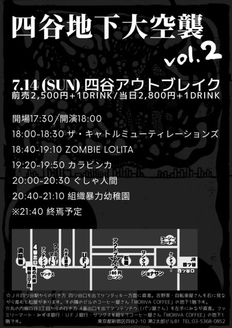 2019年7月14日(sun) 四谷アウトブレイク 組織暴力幼稚園企画「四谷地下大空襲vol.2」 OPEN/START 17:30/18:00 前売2,500yen(+1drink)/当日2,800yen(+1drink) ■ぐしゃ人間 ■カラビンカ ■ZOMBIE LOLITA ■ザ・キャトルミューティレーションズ ■組織暴力幼稚園 <TimeTable> 18:00-18:30 ザ・キャトルミューティレーションズ 18:40-19:10 ZOMBIE LOLITA 19:20-19:50 カラビンカ 20:00-20:30 ぐしゃ人間 20:40-21:10 組織暴力幼稚園 21:40 終焉予定 予約:https://www.yo-chien.love/yoyaku/