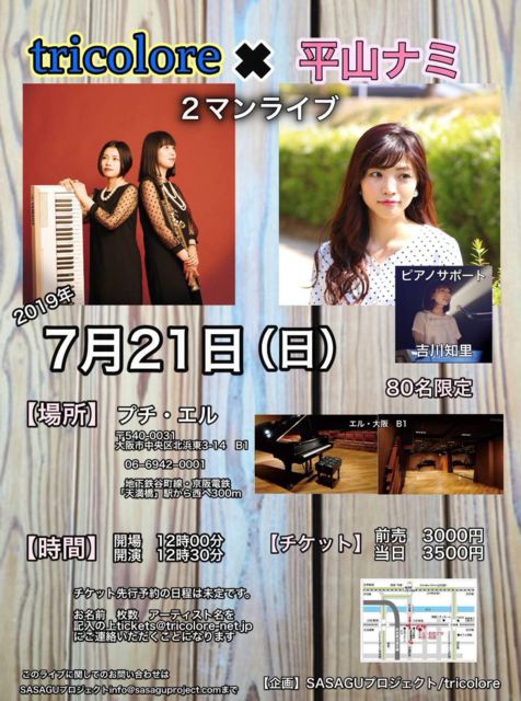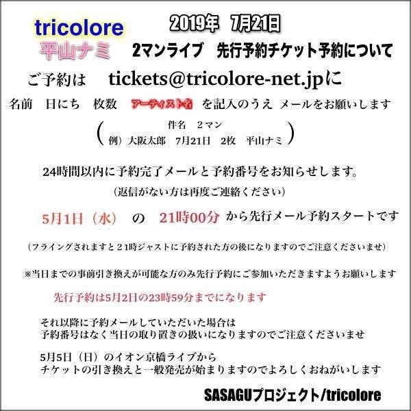 tricolore¡ßÊ¿»³¥Ê¥ß2¥Þ¥óÀè¹ÔͽÌó 2019ǯ 5·î 1Æü 21:00¡Á2019ǯ 5·î 2Æü 23:59 ÀâÌÀ: ¢£7·î21Æü(Æü) tricolore¡ßÊ¿»³¥Ê¥ß(withµÈÀîÃÎΤ) 2¥Þ¥ó¥é¥¤¥Ö (80¿Í¸ÂÄê) ¡Ú»þ´Ö¡Û ³«¾ì12:00/³«±é12:30 ¡Ú¥Á¥±¥Ã¥È¡Û Á°Çä 3,000±ß ÅöÆü 3,500±ß ¡ÚÀè¹ÔͽÌó¡Û5/1(¿å)21:00¡Á5/2(ÌÚ)23:59¤Þ¤Ç tickets@tricolore-net.jp¤Ø(ÊÖ¿®¤¬¼õ¤±¼è¤ì¤ëGmail¤Ê¤É¤ÎPC¥¢¥É¥ì¥¹¤ò¿ä¾©¡¢¤â¤·¤¯¤Ï¥É¥á¥¤¥óÅÐÏ¿¤ò¤ª´ê¤¤¤·¤Þ¤¹¡£) ·ï̾ 2¥Þ¥ó ËÜʸ ¤ªÌ¾Á°¡¢Æü¤Ë¤Á¡¢Ëç¿ô¡¢¥¢¡¼¥Æ¥£¥¹¥È̾(Îã:¥È¥ê¥³ÂÀϺ¡¢7/21¡¢ 1Ëç¡¢tricolore) ¢¨7/21ÅöÆü¤Þ¤Ç¤Ë¤ª°ú