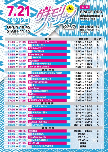 ¡Ö¥²¥¥â¥êde¥Ñ¡¼¥ê¥Ê¥¤ vol.21¡× Æü»þ¡§07/21(Æü) ³«¾ì10:45 / ³«±é11:15 ²ñ¾ì¡§½ÂëSPACE ODD ÎÁ¶â¡§Á°Çä3,000±ß / ÅöÆü3,500±ß¡ÊDÊ̡ˢ¨ºÆÆþ¾ì²Ä(Í×1D) ½Ð±é¡§AQUALOOPS / ¥¢¥¹¥È¥ì¥¤¥¢* / 81moment / ºù²Öà¥Ì¡ / ¤ª¤ä¤¹¤ß¥»¥«¥¤ / KissBeeYouth / ·¯¤ÎÎ٤Υ饸¤«¤ë¤ó / ¶õÁÛ¤ÈÌÑÁۤȥ¥ß¤ÎÎø¤·¤¿À¤³¦ / ¹õ¤ÏÃå¤Ê¤¤¡£ / ÃϹö¤Þ¤Ç30¥»¥ó¥Á / ·²ÀĤÎÀ¤³¦ / SW!CH / DiBLACK / Å·»ÈÆÍÈ´¥ËÆÉ¥ß / TokyoFlamingo / ¥Ë¥³¥Ë¥³♡STREET / ¥Ë¥³¥Ë¥³♡LOVERS / ¤Ï¤Ã¤Ô¤Ã¤Ô / P-school / ¤Þ¥Ã / MAJIBANCH / ¸¸.no / ̤´°À®¥ê¥Ã¥×¥¹¥Ñ¡¼¥¯¥ë /