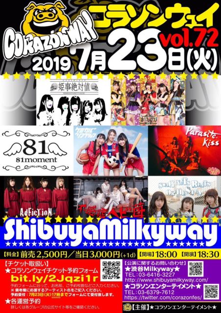 ¡Ö¥³¥é¥½¥ó¥¦¥§¥¤vol.72¡× Æü»þ¡§07/23(²Ð) ³«¾ì18:00 / ³«±é18:30 ²ñ¾ì¡§½ÂëMilkyWay ÎÁ¶â¡§Á°Çä2,500±ß / ÅöÆü3,000±ß¡ÊDÊÌ¡Ë ½Ð±é¡§É±»öÀäÂÐÃÍ/¤Ï¤Ã¤Ô¤Ã¤Ô/81moment /arasite.kiss/¥±¥ß¥«¥ë⇄¥ê¥¢¥¯¥·¥ç¥ó/ÉÔ´¶¾É¥Ø¥Óçõ/AdFicTioN/SWAG NUTS BEATS ORCHESTRA