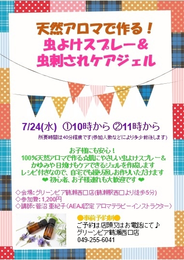 天然アロマで作る!虫よけスプレー&虫刺されケアジェル お子様にも安心! 100%天然アロマで作る☆肌にやさしい虫よけスプレー&かゆみや日焼けもケアできるジェルを作ります。 レシピ付きなので、自宅でも繰り返しお作りいただけます 初心者、お子様連れも大歓迎です 日時:7/24(水) 10時〜、11時〜 会場:グリーンピア鶴瀬西口店 (鶴瀬駅西口より徒歩5分) ※旧ドラッグエース 参加費:1,200円 (一人分の材料費) ※お子様が制作しない場合は お子様分は無料です 講師