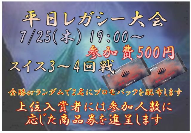 DCI¸øÇ§¡¡¥ì¥¬¥·¡¼Âç²ñ ¤Î¤´°ÆÆâ¤Ç¤¹¡£ ¼õÉÕ¤Ï ÅöÆü¡¡18¡§00¡Á19¡§00 ¤È¤Ê¤Ã¤Æ¤ª¤ê¤Þ¤¹¤Î¤Ç»²²Ã´õ˾¤Î¾ì¹ç¤Ï¾åµ¤Î»þ´Ö¤ËÃÙ¤ì¤Ê¤¤¤è¤¦¤Ë¤´ÍèŹ¤¯¤À¤µ¤¤¡£»²²Ã¤ÏÀèÃå½ç¤È¤Ê¤ê¤Þ¤¹¡£ »²²ÃÈñ¤Ï500±ß¤Ç¤¹¡£ ¹½ÃÛ·Á¼°¤Ï¥ì¥¬¥·¡¼¡Ê¡ÖÁ´¤Æ¤Î´ðËÜ¥»¥Ã¥È¡×¡õ¡ÖÁ´¤Æ¤Î¥¨¥¥¹¥Ñ¥ó¥·¥ç¥ó¡×¢¨¥¢¥ó¥°¥ë¡¼¥É¡¦¥¢¥ó¥Ò¥ó¥·¥É¤Ï½ü¤¯¡Ë¤È¤Ê¤ê¤Þ¤¹¡£°ìÉô¶Ø»ß¥«¡¼¥É¤¬¤¢¤ê¤Þ¤¹¤Î¤Ç¹½ÃۤκݤϤ´Ãí°Õ¤¯¤À¤µ¤¤¡£ ¶Ø»ß¥«¡¼¥É¤Ë¤Ä¤¤¤Æ¤Ï¤³¤Á¤é¤ò¤´»²¾È¤¯¤À¤µ¤¤¢ https://magic.wizards.com/ja/game-info/gameplay/formats/legacy ÂÐÀïÊý¼°¤Ï¥¹¥¤¥¹¥É¥í¡¼¤ÎºÇÂç4²óÀï
