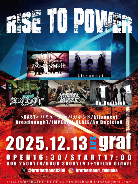 【 RISE TO POWER 】 2025.12.13(土)福岡graf バミューダ★バガボンド kitsunevi DreadnoughT IMPERIAL BLAZE An DecisioN 開場16:30/開演17:00 前売2500円/当日3000円(+1D)