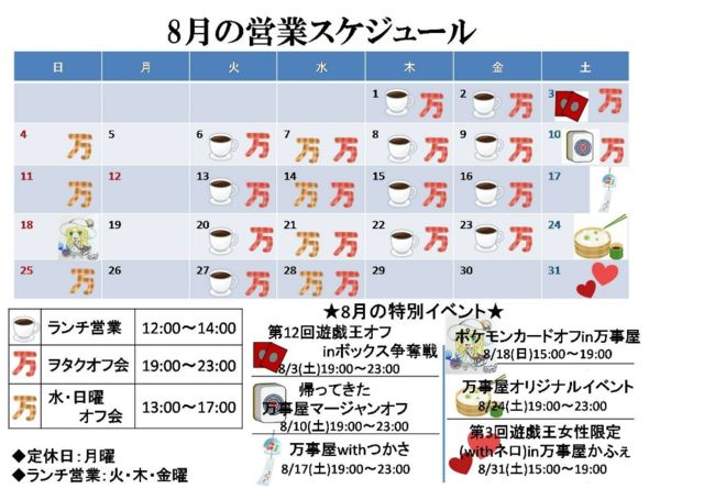 ★★万事屋オフ会スケジュール【8月】★★ ★8月のイベント★ ◆『第12回遊戯王オフinボックス争奪戦』 8/3(土)19:00 〜 23:00 ◆『帰ってきた 万事屋マージャンオフ』 8/10(土)19:00 〜 23:00 ◆『万事屋withつかさ』 8/17(土)19:00 〜 23:00 ◆『ポケモンカードオフin万事屋』 8/18(日)15:00 〜 19:00 ◆『万事屋オリジナルイベント』 8/24(土)19:00 〜 23:00 ◆『第3回遊戯王女性限定(withネロ)in万事屋かふぇ』 8/31(土)15:00 〜 19:00 ◆コンテンツ ◆ ・モンスト ・モンハンX ・コスプレ ・YouTube、ニコ動観賞 ・ボカロPV鑑賞&談