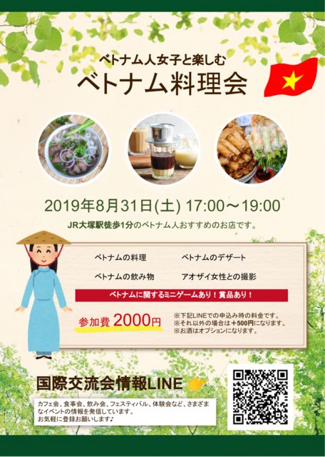 ベトナム人女子プロデュースのベトナム料理食事会を開催します。 ベトナム料理はもちろん、ベトナムの飲み物やデザート、ミニゲーム、ベトナムミニセミナーなども開催します。 ベトナム人女子と仲良くなりたい方 ベトナム料理食べたい方 ベトナムのことを詳しくなりたい方 ベトナム語勉強している方 など、ぜひご参加ください(^_^) アオザイ女性との写真撮影もできるかも?! 2019年8月31日(土) 17:00〜19:00 大塚駅近くのレストラン 参加費2000円(下記LINEからの申込みの場合) 参加費2500円(LINE以外からの場合) 申し込