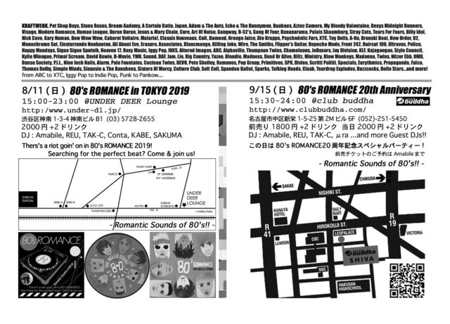 ¢£ 8/11 (Æü) 80's ROMANCE in TOKYO 2019 15:00-23:00 @UNDER DEER Lounge http://www.under-d1.jp ÅìµþÅÔ½Âë¶è¿ÀÆî¥Ó¥ëB1 TEL : 03-5728-2655 ÅöÆü 2000±ß+2¥É¥ê¥ó¥¯ DJ : Amabile, REU, TAK-C, Conta, KABE, SAKUMA 80's ROMANCE in TOKYO¤âº£Ç¯¤Ç19ǯÌÜ¤ËÆÍÆþ¡ª º£Ç¯¤âºòǯ¤Ë°ú¤Â³¤UNDER DEER Louge¤Ç³«ºÅ¤¹¤ë±¿¤Ó¤È¤Ê¤ê¤Þ¤·¤¿¡£ 11Æü¤ÏSUMMER SONIC 2019¤Î°ì½µÁ°¤Ë¤·¤Æ¡¢¤ªËߵ٤ߤȤ¤¤¦ºÇ¹â¤ÎÆüÄø¡ª ¤½¤·¤ÆÇ¯¹æ¤¬ÎáϤËÊѤï¤ê½é¤Î80's ROMANCE¤È¤¤¤¦¤³¤È¤Ç¡¢Ê¿À®¿¶¤êÊÖ¤ê´ë²è¤È¤·¤Æ¥ª¡¼¥×¥ó¤«¤é¤Î2»þ´Ö¤Û¤É90ǯÂå¤òÆÃ½¸¤·¤¿90's