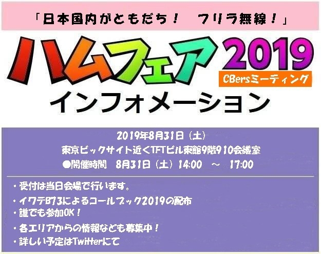 ¡Ö¥Ï¥à¥Õ¥§¥¢CBers¥ß¡¼¥Æ¥£¥ó¥°2019¡× ³«ºÅ¡ª·èÄê¡Á8/31 14:00¡Á17:00¤Þ¤Ç¡Êº©¿Æ²ñ¡Ë TFT¥Ó¥ë9F¡¢910²ñµÄ¼¼¤Ë¤Æ³«ºÅÃפ·¤Þ¤¹¡£¼õÉÕ¤ÏÅöÆü²ñ¾ì¤Ë¤Æ¹Ô¤¤¤Þ¤¹¡£Æ±»þ¤Ë¥¤¥ï¥ÆB73¶É¤Ë¤Æ¥³¡¼¥ë¥Ö¥Ã¥¯2019¤ÎÇÛÉÛ¤ò¹Ô¤¤¤Þ¤¹¡£³Æ¥¨¥ê¥¢¤«¤é¤Î¾ðÊó¤Ê¤É¤â½¸¤¤¤Þ¤¹¤Î¤Ç¡¢¤´»²²Ã¤ªÂÔ¤Á¤·¤Æ¤¤¤Þ¤¹¡£ÈͶRCÉü³è¥Ï¥à¥Õ¥§¥¢²ñ¾ì¤Ë¤Æ¸áÁ°Ã泫ºÅͽÄê¡Á¡Ö¥Ï¥à¥Õ¥§¥¢CBers¥ß¡¼¥Æ¥£¥ó¥°20019¡×¤Ïͻֳƥ¨¥ê¥¢³Æ¶É¤È±þ±ç¤·¤Æ¤¤¤Þ¤¹¡£ ¾ÜºÙ¤Ï¸å¤Û¤É¥³¥Á¥é¤ÈTweet¤Ë¤Æ!
