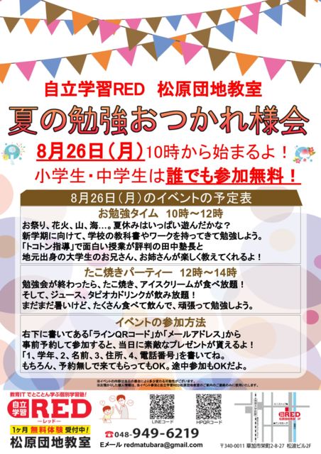 ¼«Î©³Ø½¬RED¡¡¾¾¸¶ÃÄÃ϶µ¼¼ ¡ù²Æ¤ÎÊÙ¶¯¤ª¤Ä¤«¤ìÍͲñ¡ù 8·î26Æü¡Ê·î¡Ë10»þ¤«¤é»Ï¤Þ¤ë¤è¡ª ¾®³ØÀ¸¡¦Ãæ³ØÀ¸¤Ïï¤Ç¤â»²²Ã̵ÎÁ¡ª µ¤·Ú¤ËÌ䤤¹ç¤ï¤»¤·¤Æ¤Í¡ª ÅÅÏÃÈֹ桡048-949-6219 ¡²¡²¡²¡²¡²¡²¡²¡²¡²¡²¡²¡²¡²¡²¡²¡²¡²¡²¡²¡²¡²¡²¡²¡²¡²¡²¡²¡² ¡Ú¤ªÊÙ¶¯¥¿¥¤¥à¡¡10»þ¡Á12»þ¡Û ¤ªº×¤ê¡¢²Ö²Ð¡¢»³¡¢³¤¡Ä¡£²ÆµÙ¤ß¤Ï¤¤¤Ã¤Ñ¤¤Í·¤ó¤À¤«¤Ê¡© ¿·³Ø´ü¤Ë¸þ¤±¤Æ¡¢³Ø¹»¤Î¶µ²Ê½ñ¤ä¥ï¡¼¥¯¤ò»ý¤Ã¤Æ¤¤ÆÊÙ¶¯¤·¤è¤¦¡£ ¡Ö¥È¥³¥È¥ó»ØÆ³¡×¤ÇÌÌÇò¤¤¼ø¶È¤¬É¾È½¤ÎÅÄÃæ½ÎĹ¤È Ãϸµ½Ð¿È¤ÎÂç³ØÀ¸¤Î¤ª·»¤µ¤ó¡¢¤ª»Ð¤µ¤ó¤¬³Ú¤·¤¯¶µ¤¨¤Æ¤¯¤ì¤ë¤è¡ª ¡Ú¤¿¤³¾Æ¤¥Ñ¡¼¥Æ¥£¡¼