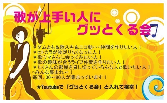 ようこそ【歌が上手い人にグッとくる会】へ 令和元年最初の伊勢崎会は、真夏のイベント盛り沢山 各方面からの車送迎も対応可能 連休真っ只中って方は、旅行のついでに遊びに来て下さい 群馬会場は、他にはない魅力がたっくさんありまーす 初めてトピを見てくれた方へ →http://mixi.jp/view_bbs.pl?id=77373699&comm_id=1012414 過去の開催の様子はこちらに動画がたっくさんあります →https://www.youtube.com/user/Tomito1976 今回の自由参加の企