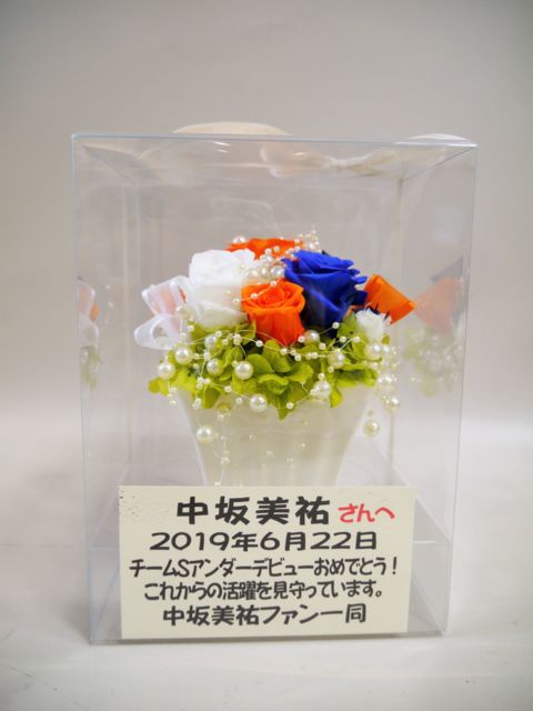 中坂美祐さんのアンダーデビューが6月22日(土)チームS 重ねた足跡公演に決定しました。 つきましては皆様からのカンパ金のご協力をいただき、当コミュニティよりお祝いのお花としてサイリウムカラーのプリザーブドフラワー(7000円)を贈らせていただこうと思います。 (他の9期生のアンダーデビューのお祝いと同じものとする予定です。) お花は6月22日のチームS公演に劇場に届くように手配いたします。 こちらの企画に賛同いただける方で費用の負担が可能な方は協力金として1口500円最大4口まで募集させていただきます。 【参加費用】