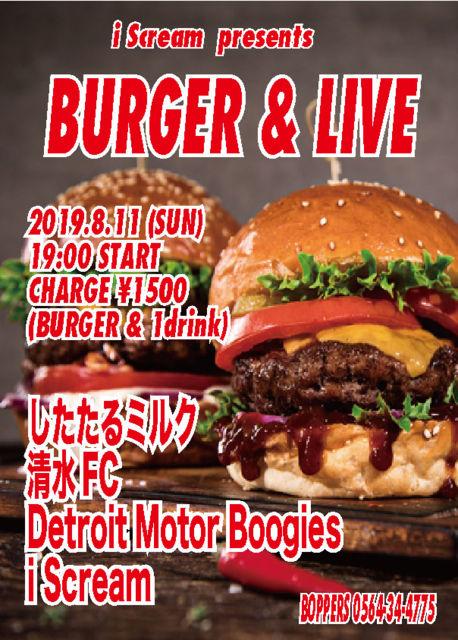 i Scream presents BURGER & LIVE 2019.8.11 (SUN) 19:00 START CHARGE \1500 (BURGER & 1drink) ¤·¤¿¤¿¤ë¥ß¥ë¥¯ À¶¿åFC Detroit Motor Boogies i Scream