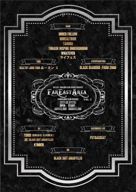 2019/08/09(¶â) HAYATO ¡ß Shinjuku club SCIENCE presents FAR EAST AREA vol.3 ¡Ò½Ð±é¼Ô¡Ó ¡ÚBAND¡Û UNDER FOLLOW Thrash Inspire Underground unrealtribe ¥é¥¤¥Õ¥§¥¹ TANIMA WHATEVER º½Çù¡¢Çúȯ ½è½÷¥Ó¥Ã¥Á¥º [BASSMUSIC LIVE] PSYBASSCAT ¡ÚMIXTURE¡Û BLACK SUIT AMARYLLIS [DJ] Akiwo(Xtreme Rebel ma'ma¡Ë kenbo(CANTOY) KOCHANG(DRAGNET) K1N0C0 K¡çDRAGON TOMO(Í·¸Â²ñ¼Ò ÀÐÅĴѸ÷) ¹â¶¶·ò»Ë(Magnet Meeting/LINK) Êþ(BLACK SUIT AMARYLLIS) ¾¾ºê·ÄÂÀ [LIVE&PARAPARA] Black Diamond -from 2000- [TEQUILA GIRL] ¤æ¤¤¡õ¤ß¤¯ [FOOD] He