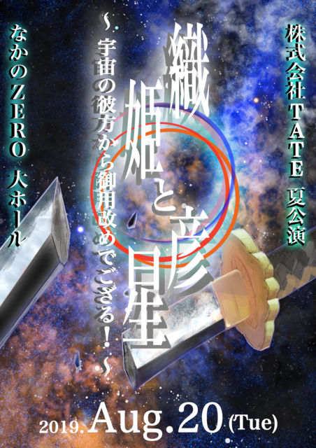 ■■■ なかのZERO 8月公演 ■■■ 株式会社TATE 2019年夏公演 「織姫と彦星 〜宇宙の彼方から御用改めでござる!〜」 ■■■ 2019年夏公演 情報解禁 ■■■ 殺陣・ダンス満載のエンタメ時代劇!! 織姫と彦星をモチーフにした物語。 出演者50人で織りなす、群舞と大立ち回りが見せ場。 ●刀を使った踊り【殺陣ダンス】 ●ケレン味溢れる【本場関西の殺陣】 が生で見られる貴重な機会。 「新撰組」「坂本龍馬」「西郷隆盛」など幕末志士、「お竜」「西郷菊」「寿万宮」など幕末ヒロインズ、そして、「徳川慶喜」「徳川昭武」など江戸