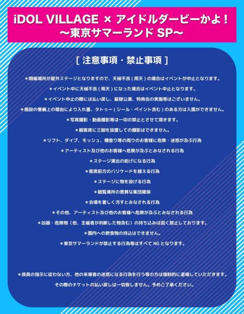 ¡ÖiDOL VILLAGE¥¢¥¤¥É¥ë¥À¡¼¥Ó¡¼¤«¤è!¡×¡ÁÅìµþ¥µ¥Þ¡¼¥é¥ó¥ÉSP¡Á Æü»þ¡§08/20(²Ð) 12:00¡Á19:00 ²ñ¾ì¡§Åìµþ¥µ¥Þ¡¼¥é¥ó¥É Ìî³°¥¹¥Æ¡¼¥¸ ÎÁ¶â¡§Æþ±àÎÁ¤Î¤ß https://www.summerland.co.jp/price/index.html ½Ð±é¡§