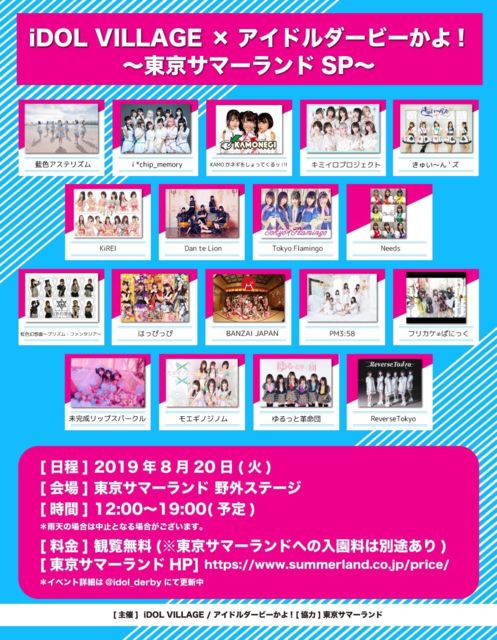 ¡ÖiDOL VILLAGE¥¢¥¤¥É¥ë¥À¡¼¥Ó¡¼¤«¤è!¡×¡ÁÅìµþ¥µ¥Þ¡¼¥é¥ó¥ÉSP¡Á Æü»þ¡§08/20(²Ð) 12:00¡Á19:00 ²ñ¾ì¡§Åìµþ¥µ¥Þ¡¼¥é¥ó¥É Ìî³°¥¹¥Æ¡¼¥¸ ÎÁ¶â¡§Æþ±àÎÁ¤Î¤ß https://www.summerland.co.jp/price/index.html ½Ð±é¡§