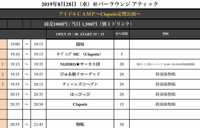 ¡Ö¥¢¥¤¥É¥ëCAMP¡ÁClapotisÄê´ü¸ø±é¡Á¡× Æü»þ¡§08/28(¿å) ³«¾ì19:00 / ³«±é19:15 ²ñ¾ì¡§Àîºê¥¯¥é¥Ö¥Á¥Ã¥¿¡¦¥Ð¡¼¥é¥¦¥ó¥¸¥¢¥Æ¥£¥Ã¥¯ ÎÁ¶â¡§1,000±ß¡ÊDÊÌ500±ß¡Ë ½Ð±é¡§Clapotis / ¥Æ¥£¡¼¥ó¥º¡ù¥Ø¥Ö¥ó / ¤Ï¤Ã¤Ô¤Ã¤Ô / NIJIIRO¡ú¥µ¡¼¥«¥¹ÃÄ / ¤Ô¤å¤¢Ì¼¥ê¥í¡¼¥Ç¥Ã¥É ¡Ú¥¿¥¤¥à¥Æ¡¼¥Ö¥ë¡Û ½Ð±é¡§20:15¡Á20:35 ʪÈΡ§½ª±é¸å(20:45¡Á21:45)