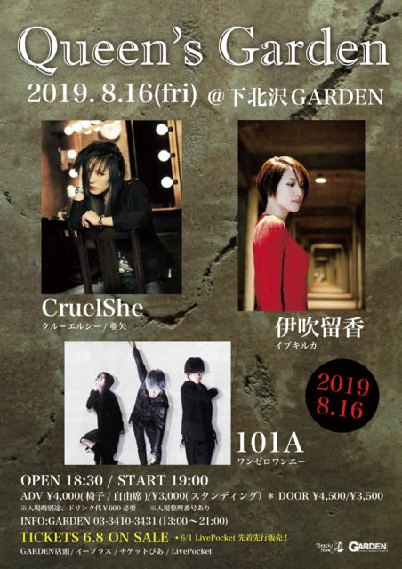 ¤â¤Ï¤äï¤â¸«¤Æ¤Ê¤µ¤½¤¦¤Ê¤³¤³¤Ç¤¹¤¬¡¢ °ì±þ¤ªÃΤ餻¤µ¤»¤Æ¤¯¤À¤µ¤¤¤Þ¤»¡£ ¡ØQueen's Garden¡Ù¡÷²¼ËÌÂôGARDEN http://gar-den.in/?m=20190816 ¢¡°Ë¿áα¹á ¡¡http://www.ibuki-ruka.com/ ¡¡Guitar¡§³á¸¶·òÀ¸ ¡¡Bass¡§¥¿¥«¥Ð¥¿¥±½Ó ¡¡Drums¡§Ä®Åŧ ¢¡CruelShe (°¡Ìð) ¡¡http://beachnine.com/menu/340704 ¡¡http://beachnine.com/info ¡¡https://www.instagram.com/cruelshe/?hl=ja ¢¡101A ¡¡https://101a.org/ ³«¾ì¡§18:30 ³«±é¡§19:00 Á°Çä(°Ø»ÒÀÊ)¡§¡ï4,000 ÅöÆü(°Ø»ÒÀÊ)¡§¡ï4,500 Á°Çä(Ω¤Á¸«)¡§¡ï3,000 ÅöÆü(Ω¤Á