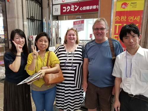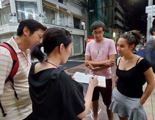 新企画! 英語でインタビュー!『Youは何しに心斎橋へ?』 次回は8/24(土)17時〜です 前回はたくさんの方の参加ありがとうございました! 一組3〜4人の4チームに分かれて通りすがりの外国人を捕まえたら 英語で色々質問してもらいました。 各グループ質問用紙に聞いた答えを書き込んでもらいます。 まずはみんなで一緒にいざ商店街へ! 最初は誰に声かけよう〜 なんて迷っていましたが 時間がないのでとりあえず声掛け! そうしてアタックしているうちに最初は勇気が出なくても 話すうちにどんどん積極的に話せるようになり、 遠