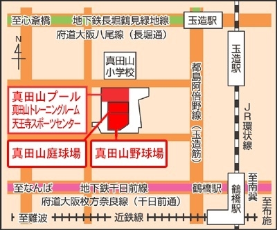天王寺スポーツセンター 【住所】〒543-0015 大阪市天王寺区真田山町5番109号 TEL 6765-0043 FAX 6765-0083 【最寄り駅】 地下鉄鶴見緑線「玉造」駅 2番出口より南400m(徒歩6分) JR「玉造」駅から 南西400m(徒歩6分) 「真田山プール」併設 【駐車場】 第1駐車場11台 身障者用2台 第2駐車場46台 有料1時間350円(1時間単位)