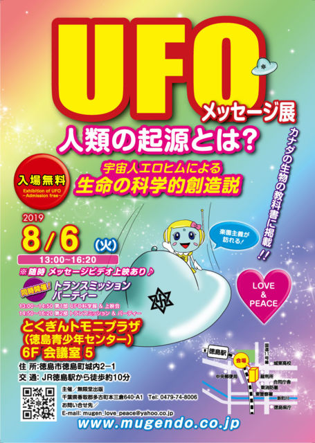 ★第1部「地球人は科学的に創造された」パネル展&上映会 【開場】14:00 【開演】14:00-14:40 どなた様もご自由にご入場できます♪ お気軽にお越し下さいませ(^-^)/ カナダの生物の教科書に掲載されました エロヒムによる科学的創造論をお伝えいたします。 ★第2部トランスミッション&パーティー♪♪♪ 【開演】 14:40-16:20 トランスミッションとは、創造者エロヒムのコンピューターに細胞の設計図 (個々人のDNA配列)を伝送するイベントです。 「宇宙人からのメッセ