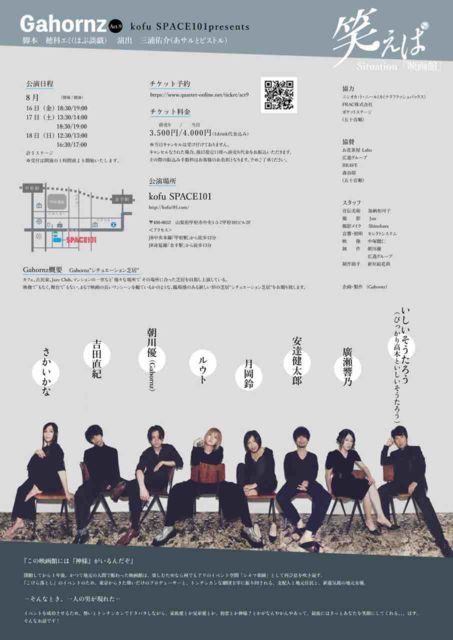 【あらすじ】 『この映画館には『神様』がいるんだぞ』閉館してから1年後、かつて地元の人間で賑わった映画館は、楽しむためなら何でもアリのイベント空間「シネマ楽園」が再び息を吹き返す。 (以下略) 【キャスト】 さかいかな/月岡鈴 他 【スケジュール】 8/16(金) 19:00〜 8/17(土) 14:00〜、 19:00〜 8/18(日) 13:00〜、 17:00〜 【全5回】*開場は30分前 脚本:穂科エミ 演出:三浦祐介
