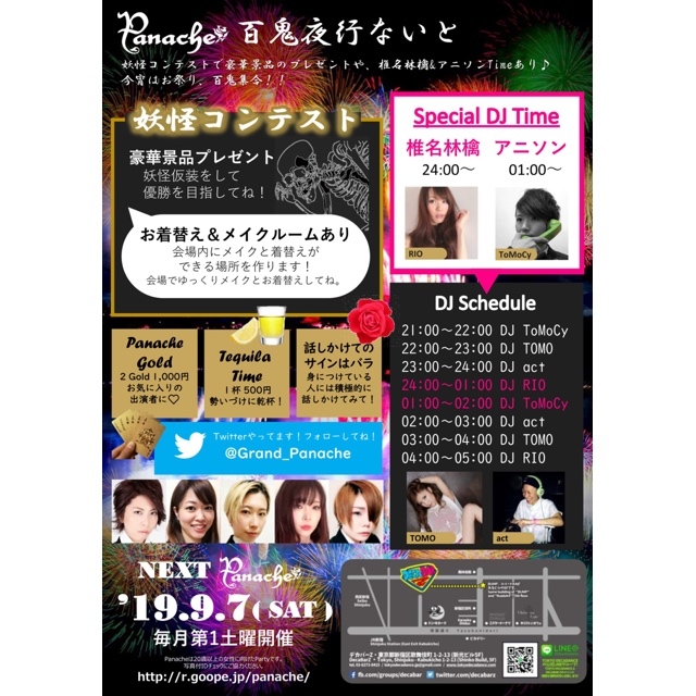 8/3(土)Panache 百鬼夜行ないと@歌舞伎町DECABAR Z 和装or妖怪仮装で来ると割引あるよ! 妖怪コンテストで豪華景品のプレゼントや、椎名林檎&アニソンTimeあり♪ 今宵はお祭り、百鬼集合!! ◆妖怪コンテスト 妖怪仮装をして優勝を目指してね!優勝者には豪華景品プレゼント!! ◆お着替え&メイクルームあり 会場内にメイクと着替えができる場所を作ります!会場でゆっくりメイクとお着替えしてね。 ★話し掛けてねのサインはバラ ナンパ待ちもOK ★テキーラTime 勢いづけにShotで乾杯! ★TIPをお気に入りの出演者に挟んでね