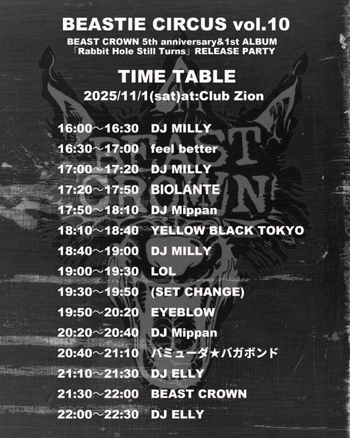 BEASTIE CIRCUS vol.10 BEAST CROWN 5th anniversary&1st ALBUM ¡ÖRabbit Hole Still Turns¡×RELEASE PARTY 2025.11.01(sat)̾¸Å²°CLUB ZiON Open 16:00 / Start 16:30 Adv \3,400 / Day \3,900 ¡Ê¡Ü1D\600) BEAST CROWN(BAND SET) ¥Ð¥ß¥å¡¼¥À¡ú¥Ð¥¬¥Ü¥ó¥É BIOLANTE (¡ÖStillness is Fractured¡× release tour) EYEBLOW feelbetter LOL YELLOW BLACK TOKYO DJ ELLY MILLY Mippan(Let's Do Nuts)